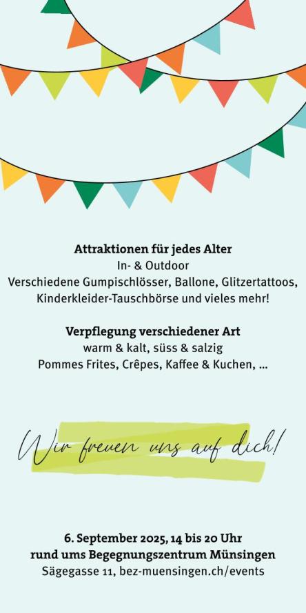 Hüpfburgen, Glitzertattoos, Kinderkleiderbörse, Pommes, Crepes, Kaffee und Kuchen und vieles mehr erwarten dich.